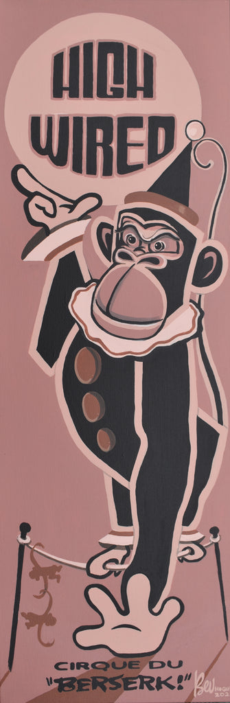 High Wired is a 12 in. x 36 in. original painting by artist Bev Hogue. It is part of the artist's Animal Crackers series.