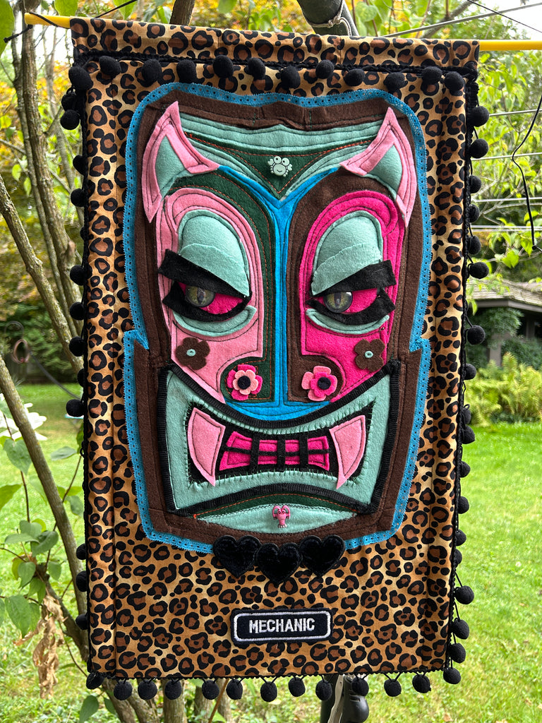 Mechanic is a 12in x 18 in felt & fabric tapestry created by Bev Hogue for her Beluxe series of blue art