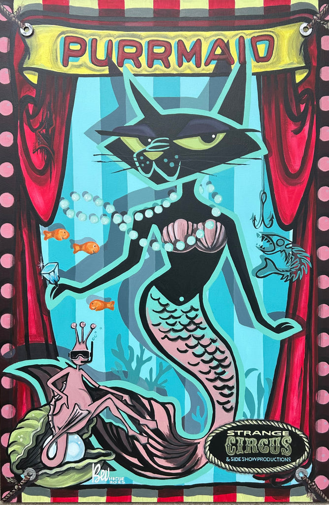 Purrmaid is a 24 in x 36 in original Beluxe painting that is part of artist Bev Hogue's Strange Circus & Sideshow series. 3D elements on the painting include metal washers on the corners of the circus tarp design.