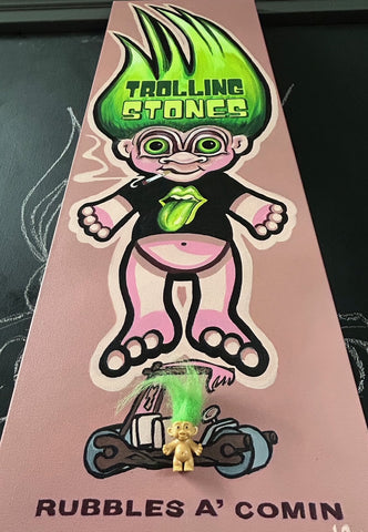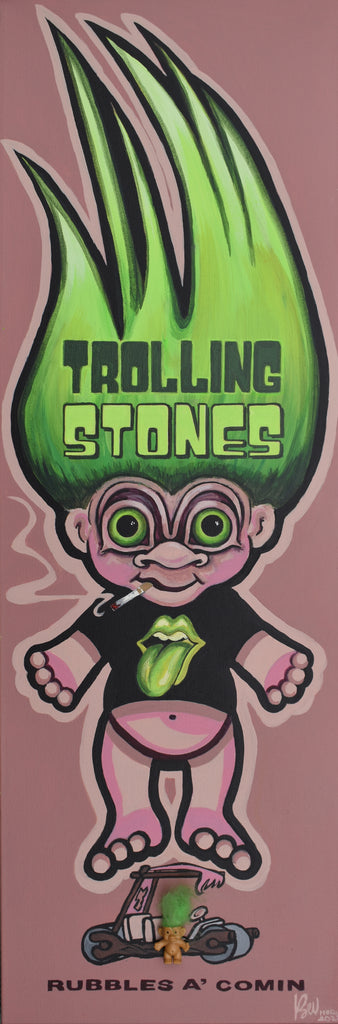 Trolling Stones is a 12 in. x 36 in. original painting by Beluxe artist Bev Hogue. It is part of the artist's Animal Crackers series.